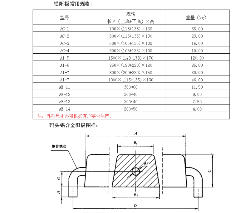 塊狀陽(yáng)極:是常見的一種,尺寸多樣,可根據(jù)碼頭的具體結(jié)構(gòu)和保護(hù)需求進(jìn)行選擇和定制,通常用于碼頭的水下部分、鋼樁等部位的保護(hù)。